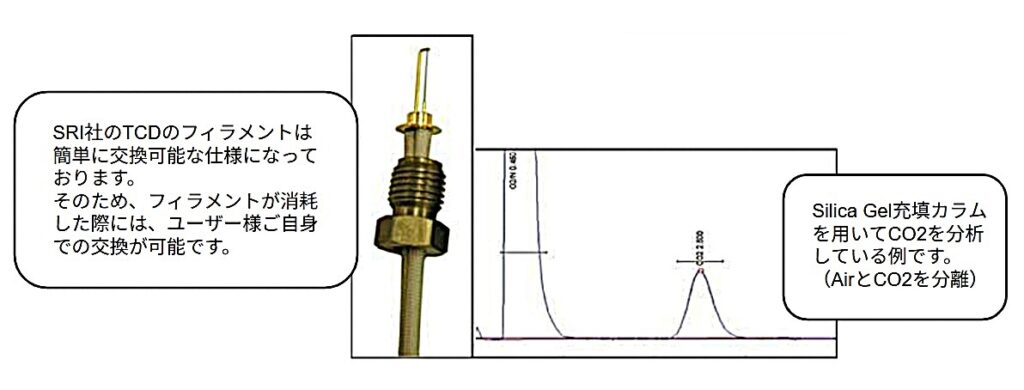 尚、TCDにはキャリアガス圧が検出されない場合に電流を遮断してフィラメントを保護する機能が搭載されていますが、すべての状況でフィラメントの損傷を防げるわけではありません。そのため、SRI社のTCDはフィラメントが焼損した場合に備えて、お客様ご自身で交換可能な設計となっております。そのため、ストックさえ持っておけば、フィラメントが焼損した場合でも迅速に復旧させることが可能です。